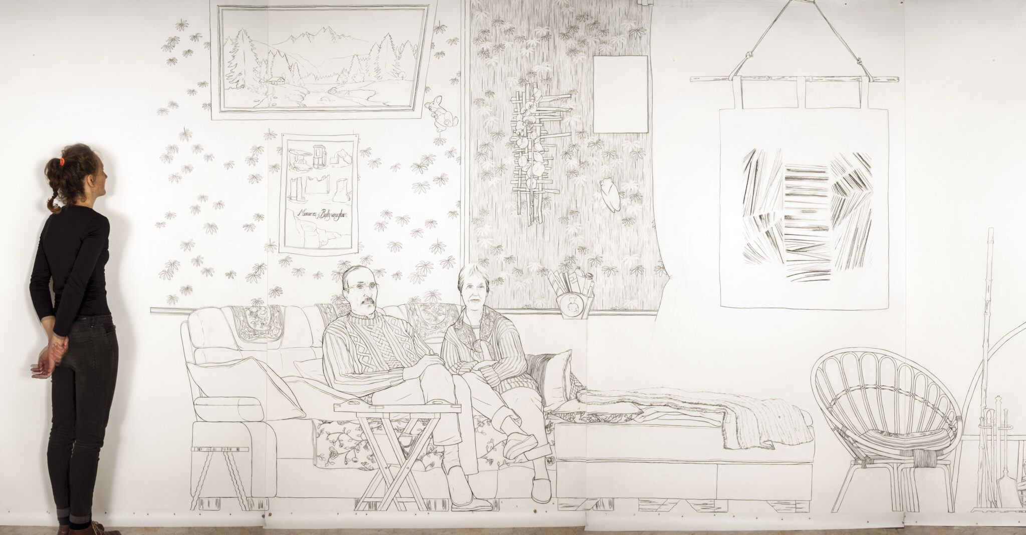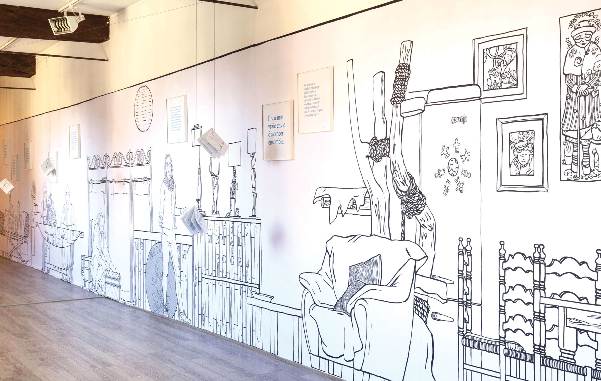 La galerie devient la salle à manger d’Angèle et Marianne, le salon de Rebecca, Sophie, Nelly et Michel, le bureau de Cyril et Martine, l’atelier de Françoise, le jardin d’Arnaud… Elle devient un lieu de vie collectif dans lequel il est possible de se projeter, de prendre une pause, de s’imaginer confortablement installé dans le fauteuil de l’un ou de l’autre, de lire les histoires de chacun et de rencontrer. Dans cette mise en scène de la vie quotidienne fougeraise, l’artiste a installé «Chroniques» et tableaux dans lesquels on peut lire des témoignages choisis pour retracer une histoire globale du territoire au travers de cette suite d’individualités.